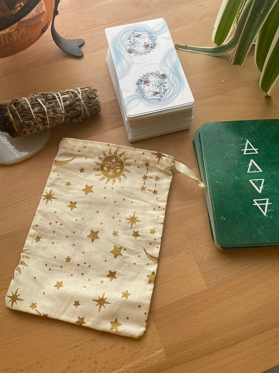 Les pochons pour tarot et oracles sont confectionnés à la main dans les mêmes tissus que nos tapis de tirage, créant ainsi une parfaite harmonie entre le moment du tirage et celui du repos.