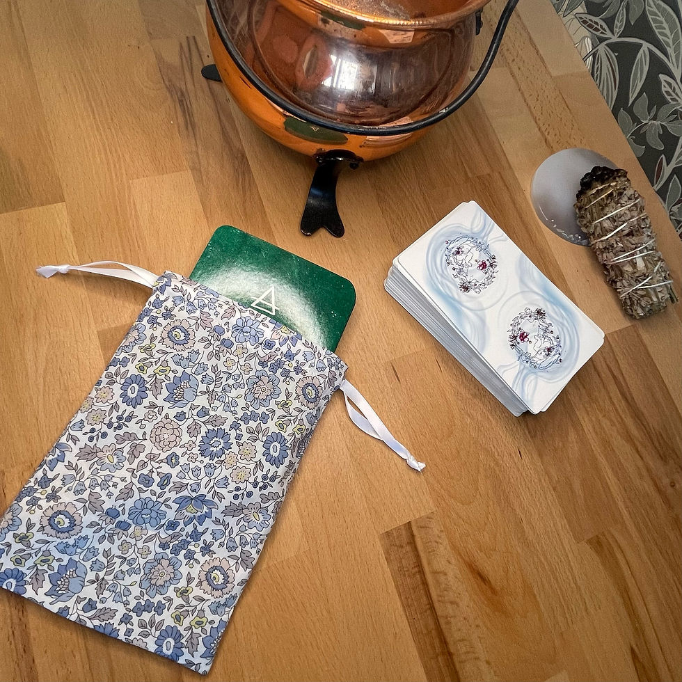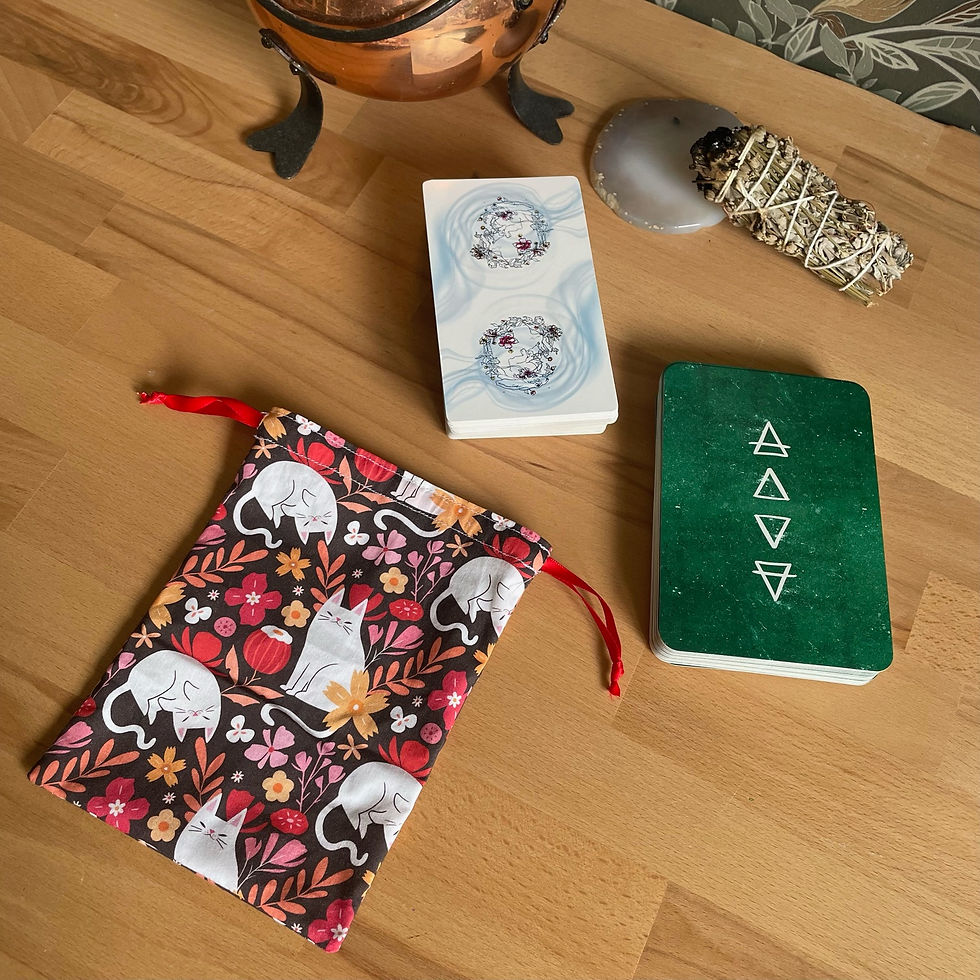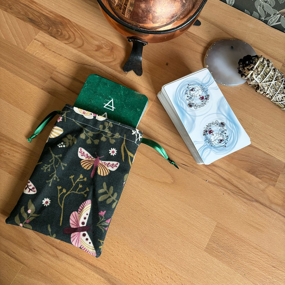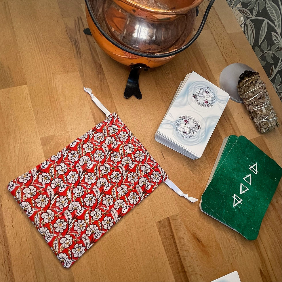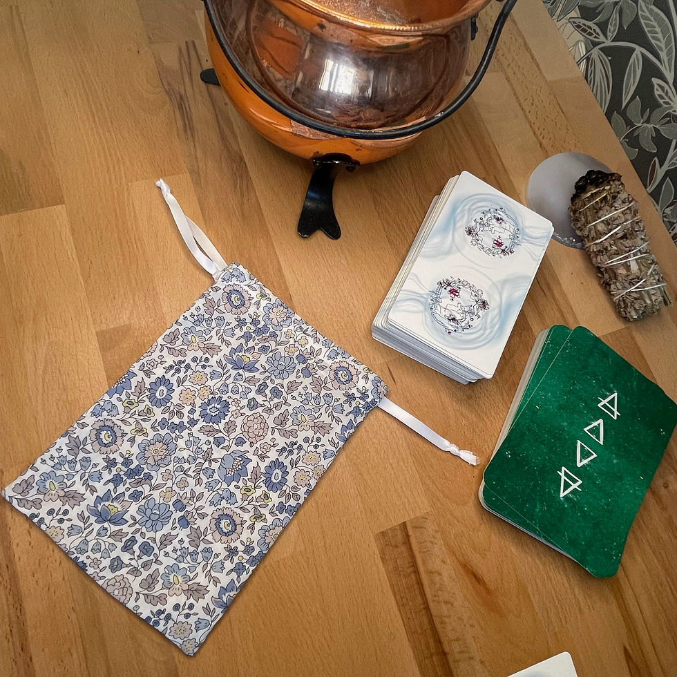Les pochons pour tarot et oracles sont confectionnés à la main dans les mêmes tissus que nos tapis de tirage, créant ainsi une parfaite harmonie entre le moment du tirage et celui du repos.