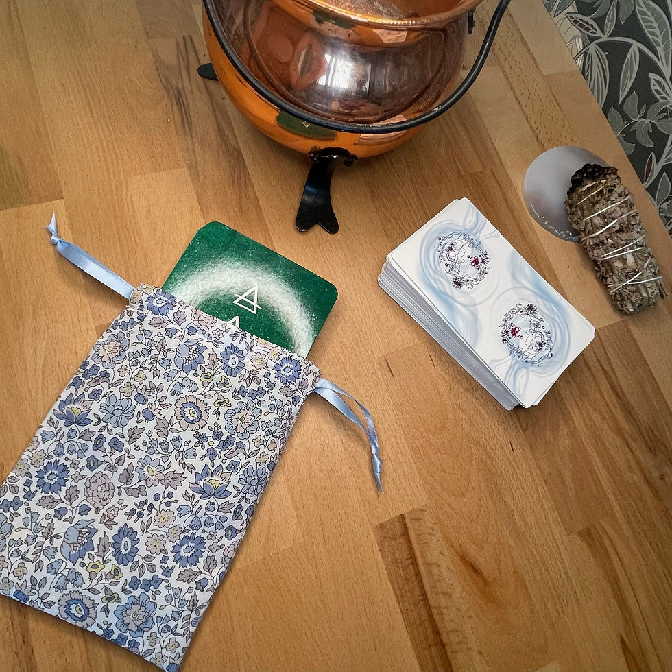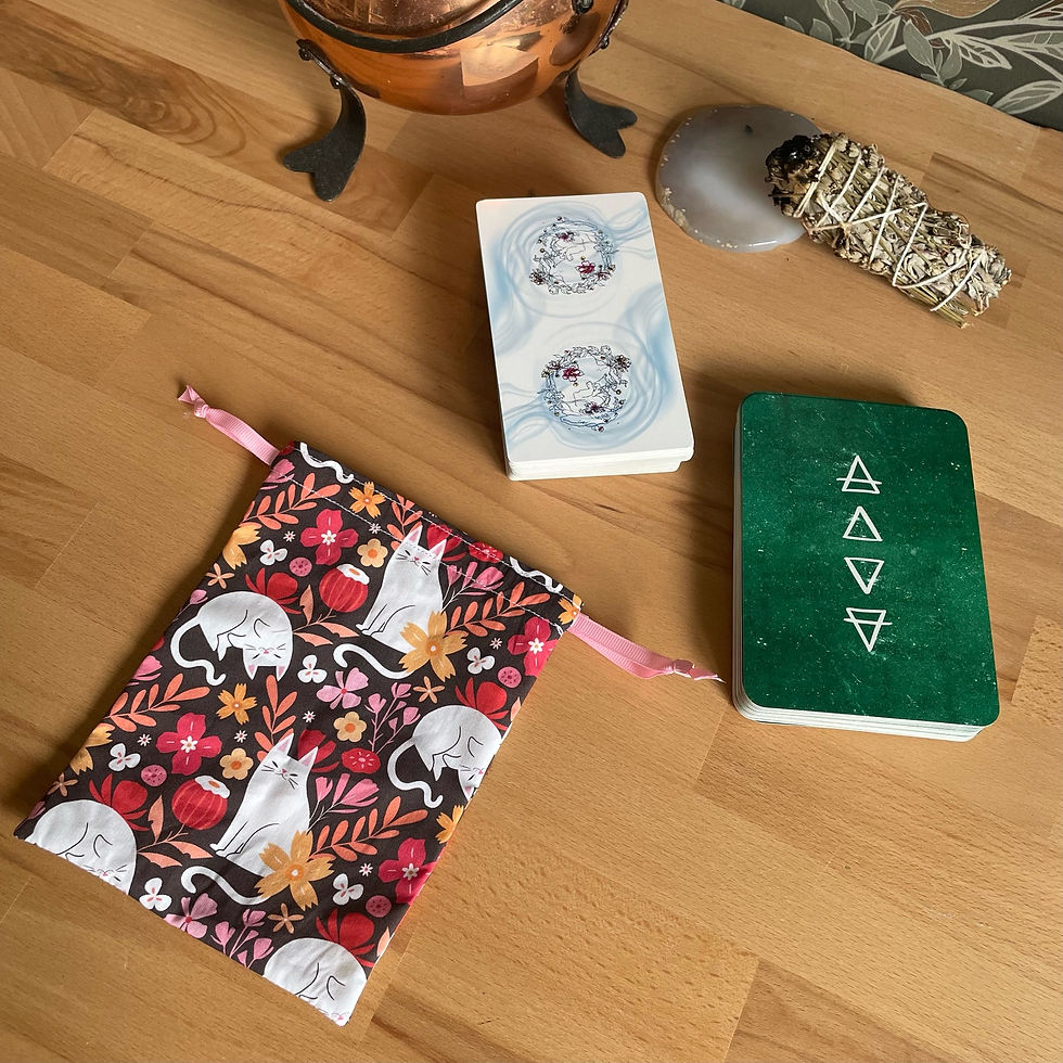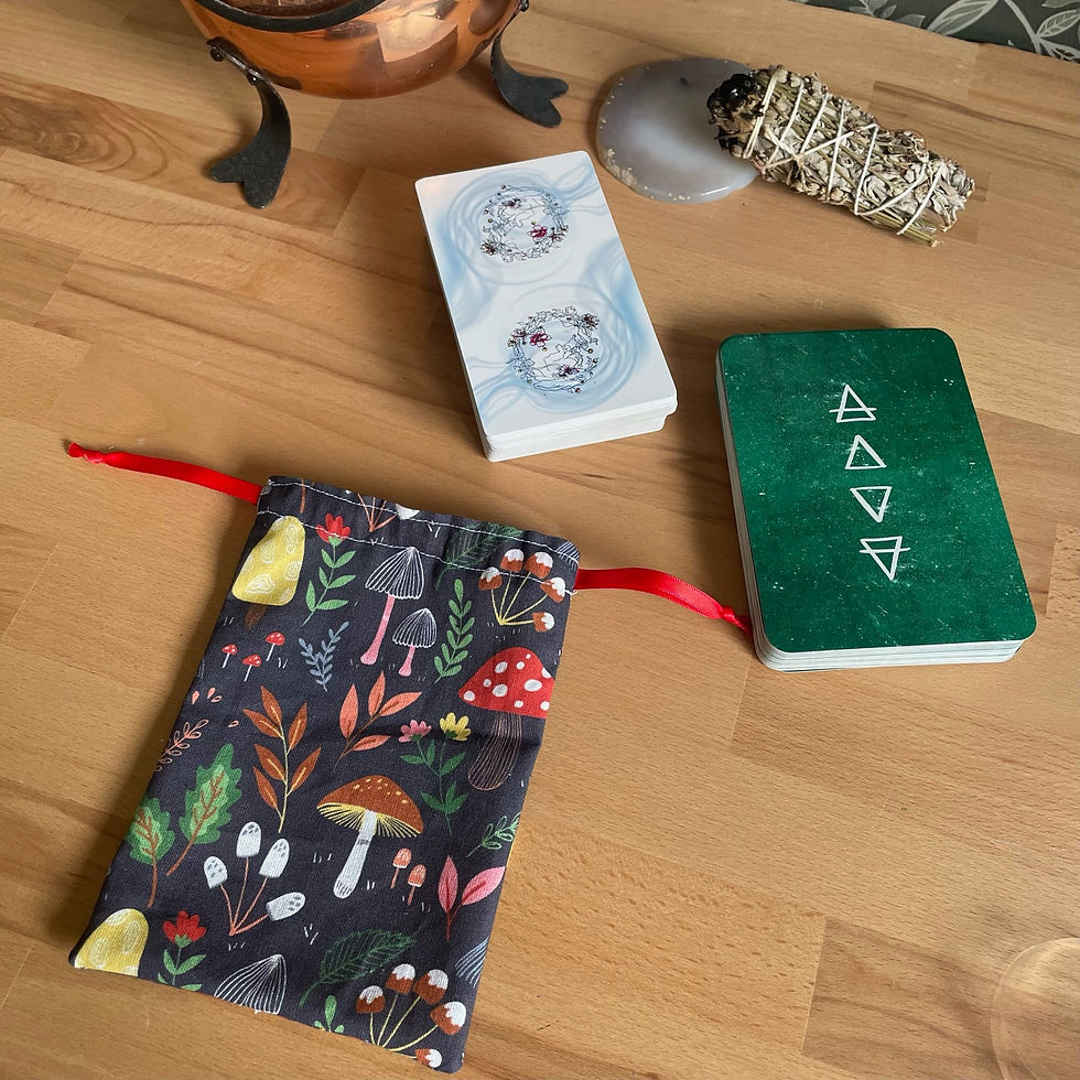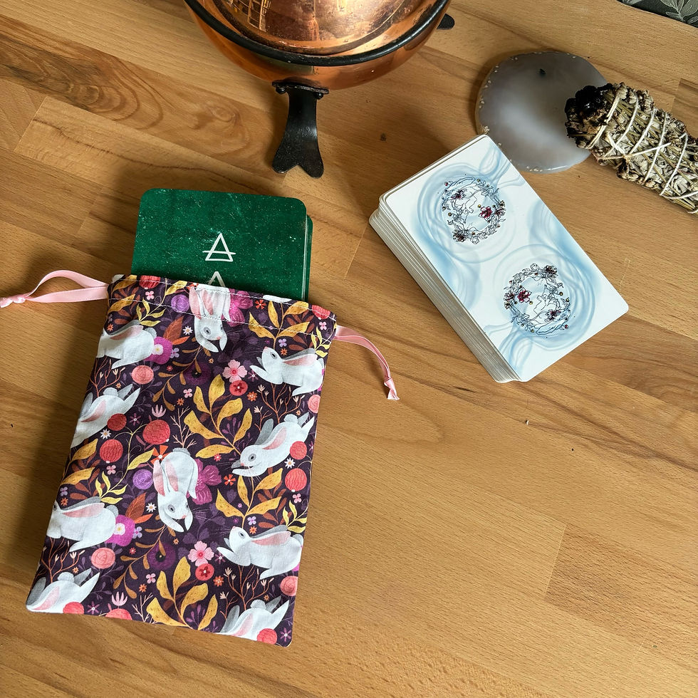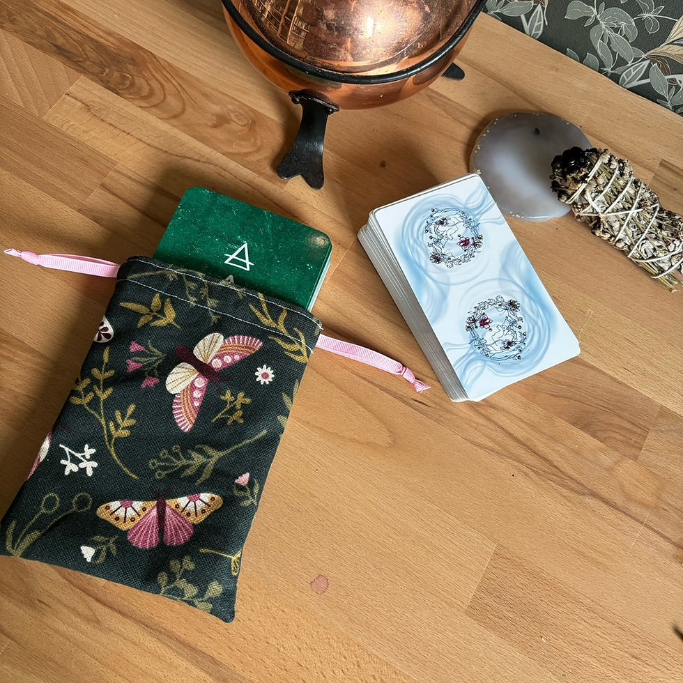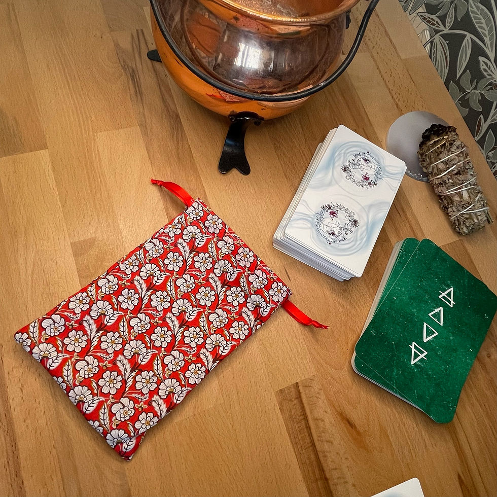 Les pochons pour tarot et oracles sont confectionnés à la main dans les mêmes tissus que nos tapis de tirage, créant ainsi une parfaite harmonie entre le moment du tirage et celui du repos.