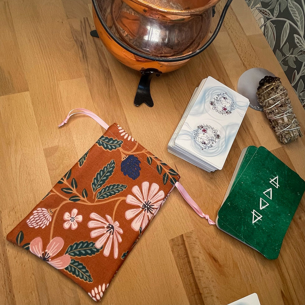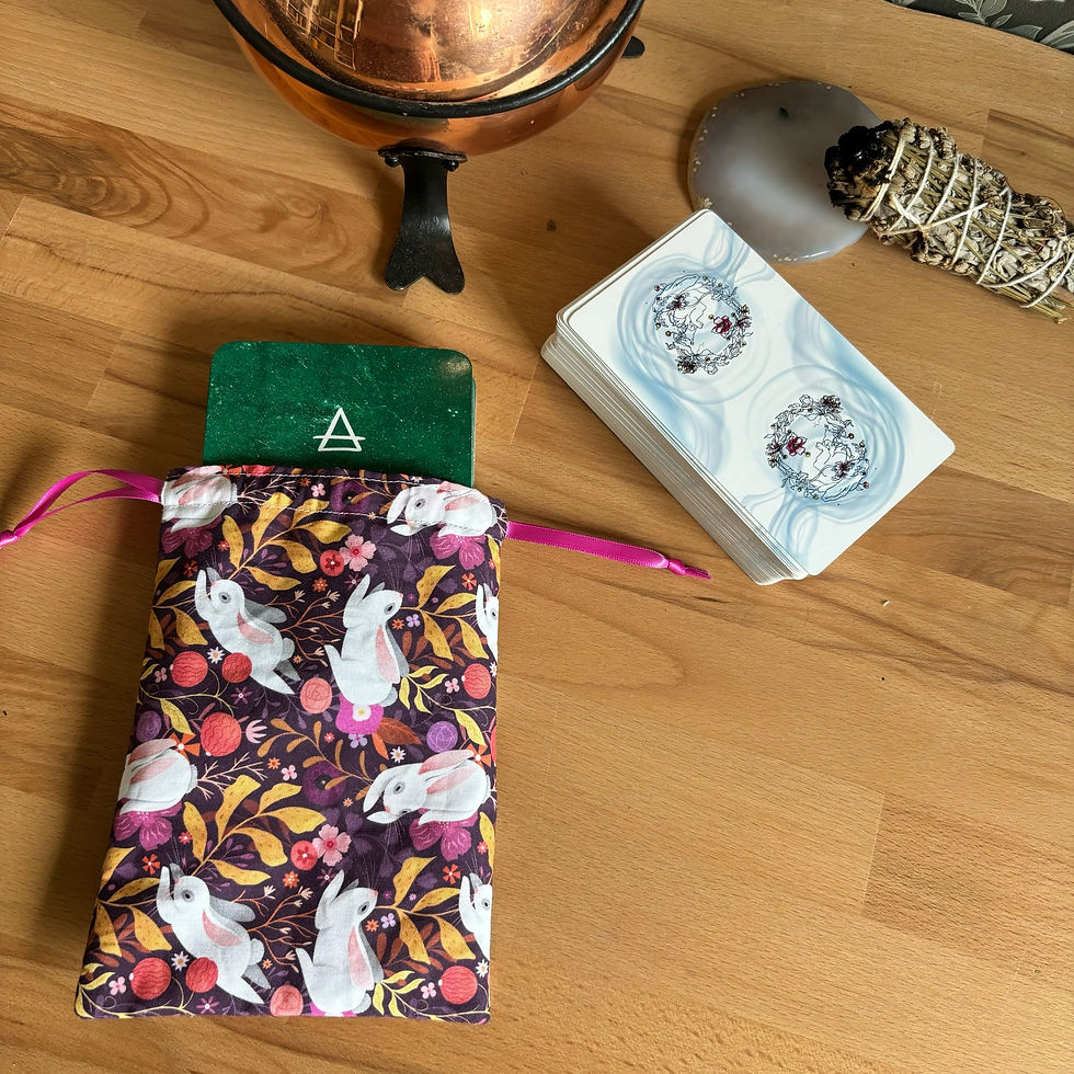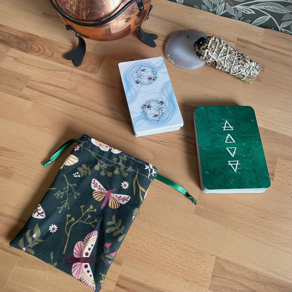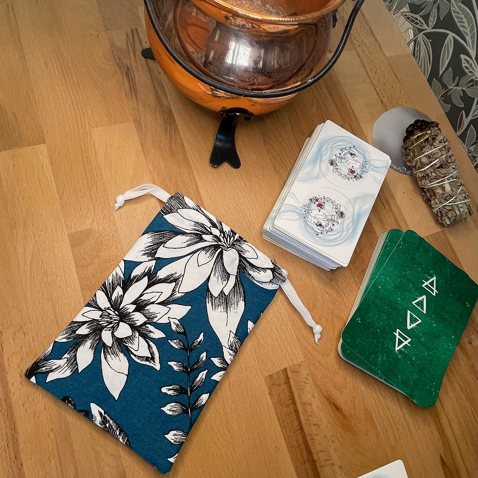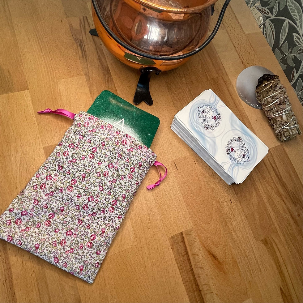 Les pochons pour tarot et oracles sont confectionnés à la main dans les mêmes tissus que nos tapis de tirage, créant ainsi une parfaite harmonie entre le moment du tirage et celui du repos.
