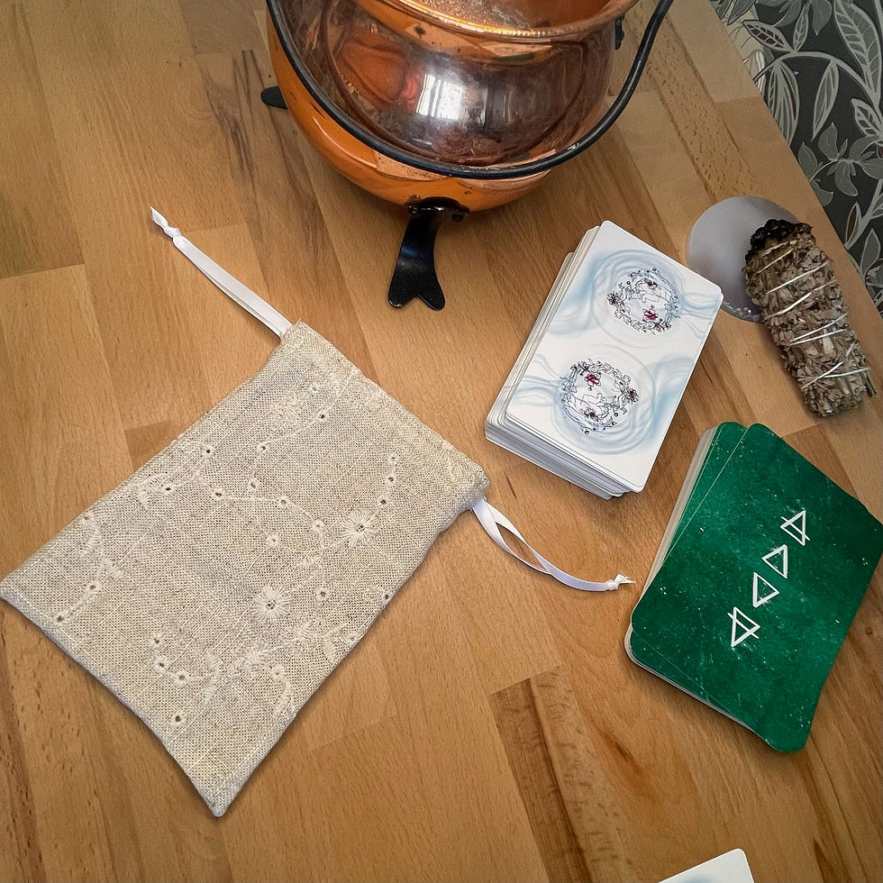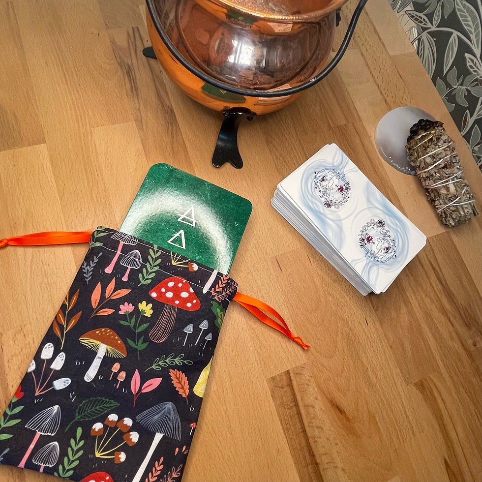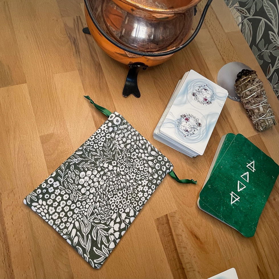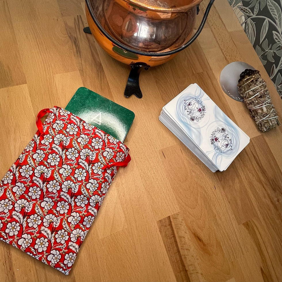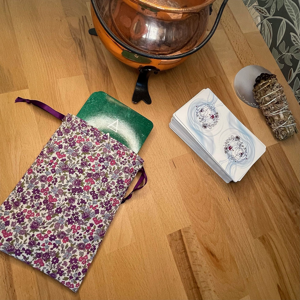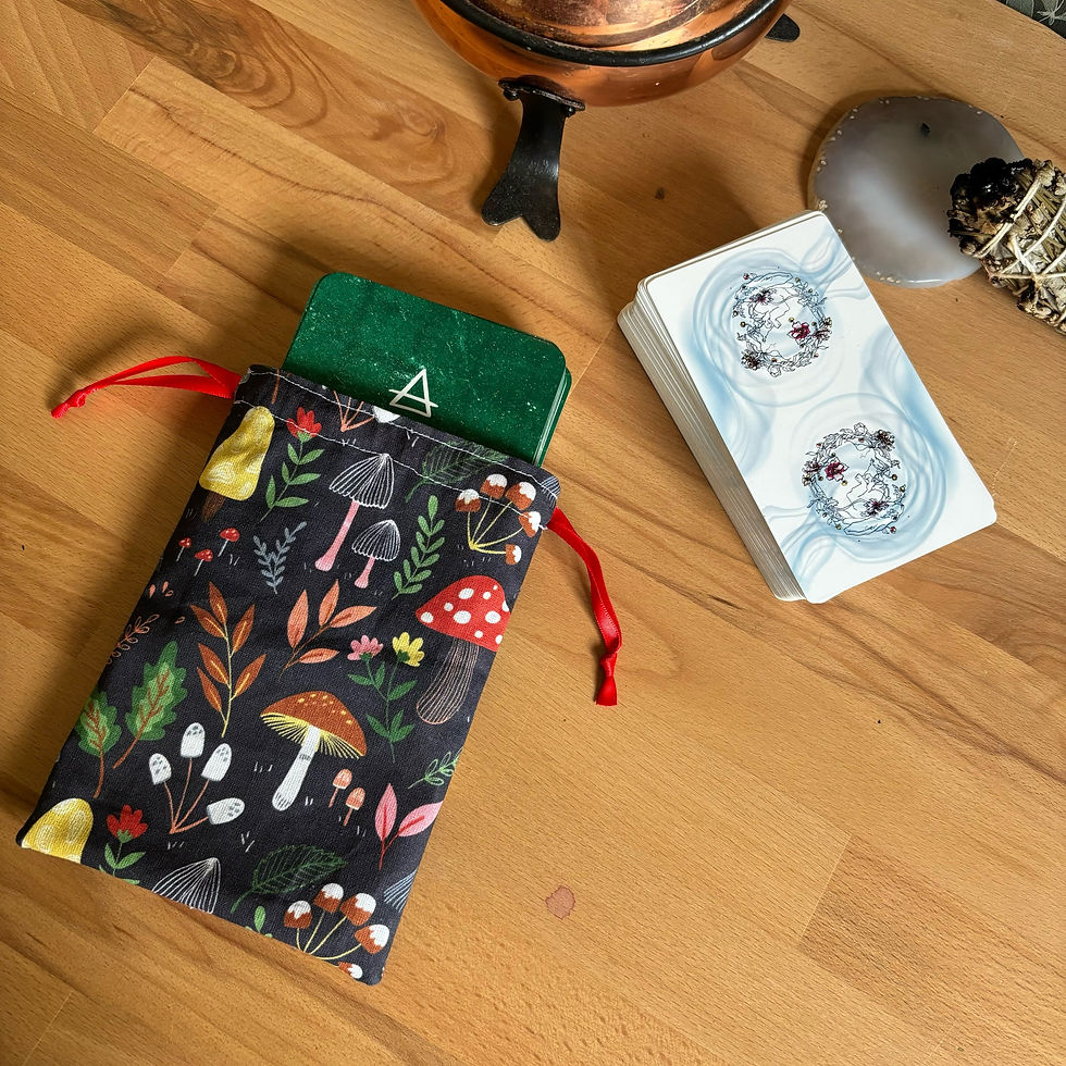 Les pochons pour tarot et oracles sont confectionnés à la main dans les mêmes tissus que nos tapis de tirage, créant ainsi une parfaite harmonie entre le moment du tirage et celui du repos.