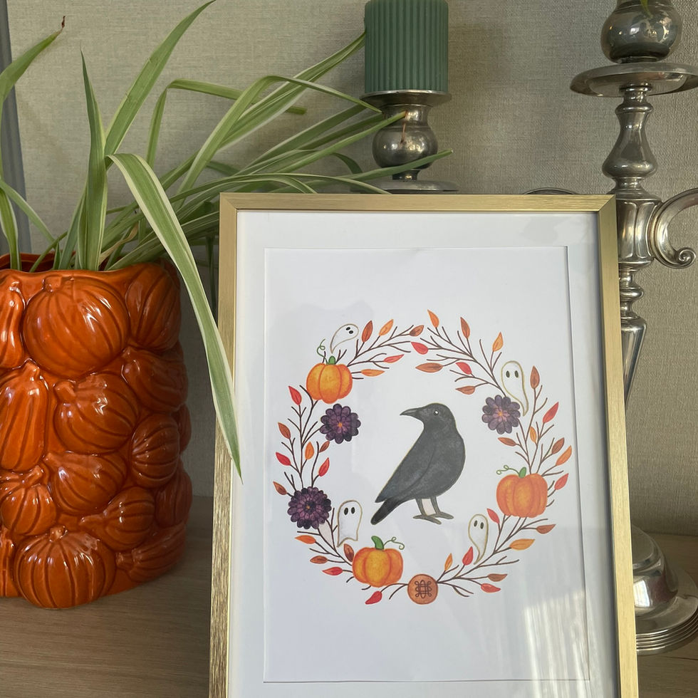 Sous la lueur de la lune, où les dernières feuilles d’automne vacillent, un corbeau veille au centre de la roue des saisons. Autour de lui, les citrouilles mûres, les chrysanthèmes et les esprits légers dansent parmi les feuilles dorées.