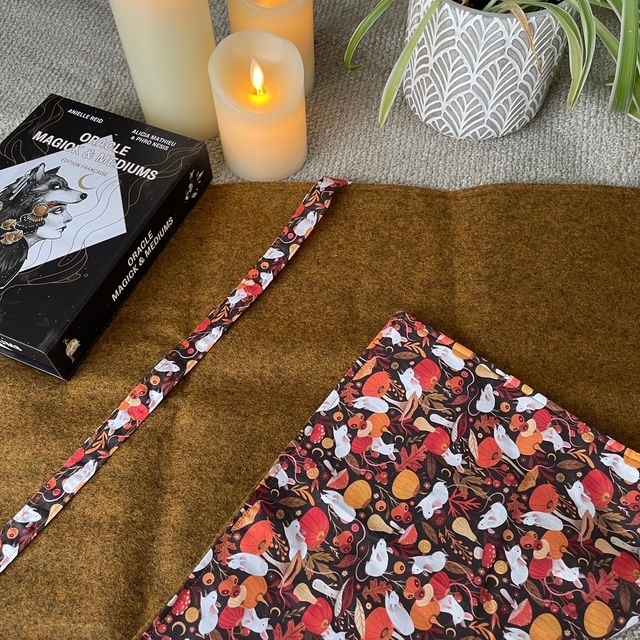 It is designed to accompany your divinatory adventures in the wilderness or in public places. It cleverly folds over your tools, ensuring that your notebook and deck of cards are always within reach, while protecting them from the hazards of travel.