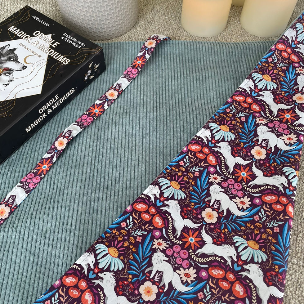 Sous un ciel violet parsemé de fleurs éclatantes, le Loup Blanc avance, libre et majestueux. Sa course silencieuse trace un chemin de rêve et d’intuition. Un tapis où la beauté sauvage rencontre la douceur florale — une balade au cœur de la magie.